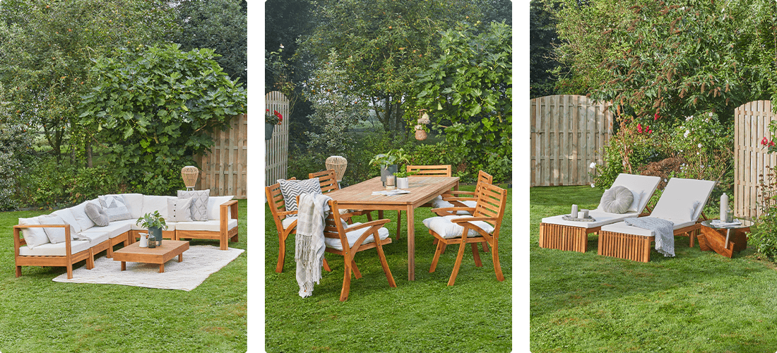 Door de veelzijdigheid van de houten tuinmeubelen kun je ze op verschillende manieren stylen. Onze massief teakhouten tuinset is bijvoorbeeld perfect om buiten te eten. Maak de set nog comfortabeler door zachte kussens in je favoriete kleur toe te voegen.